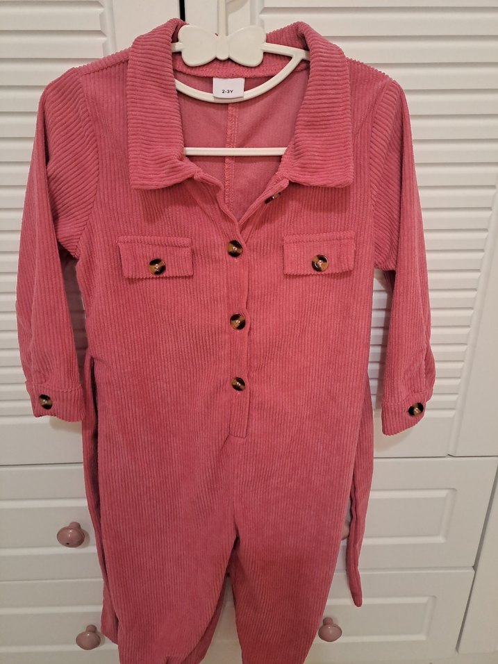 Düğmeli, uzun kollu pembe kadife kız tulumu Hiç giyilmedi.2-3 yaş ama 4 yaşa kadar olur.