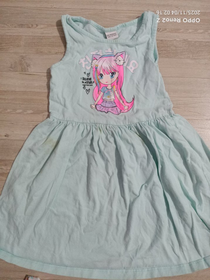 Kız çocukları için askısız, turkuaz renkli, baskılı ve bol kesimli elbisedir. Yumuşak sentetik kumaştan yapılmış, fırfır detayları vardır.