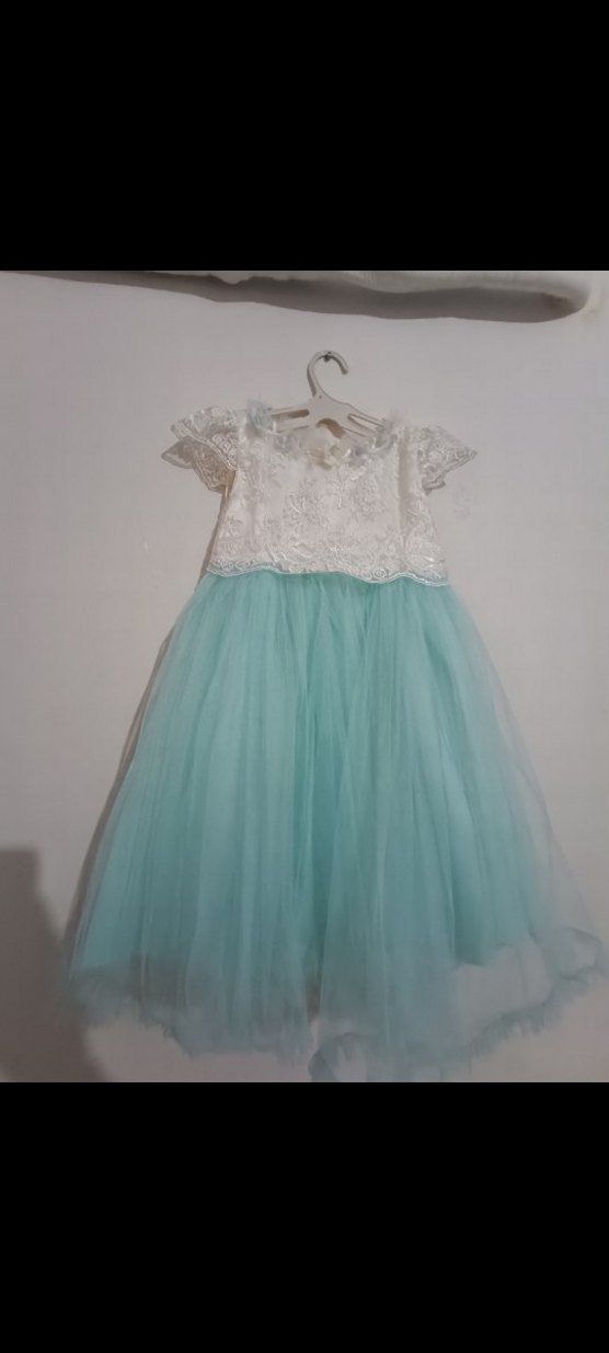 Dantel işlemeli straplez üst kısmı ve pastel turkuaz yumuşak sentetik kumaştan etek kısmı olan, kısa kollu, modern klasik tarzda kız çocuk elbisesi.