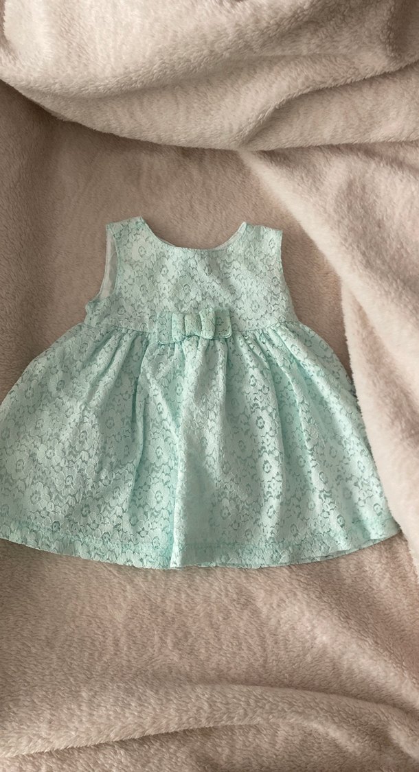 Kız çocukları için dantel işlemeli, turkuaz renkli, kolsuz ve bol kesim elbise. Belde klasik fiyonk detayı bulunur, yumuşak sentetik kumaştan yapılmıştır.