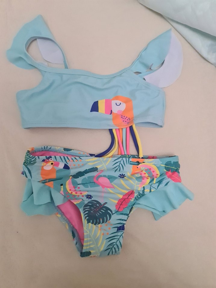 Turkuaz renkli, askılı kol detaylı, pop kültür desenli renkli kız çocuk bikini, plaj için uygundur. ️
