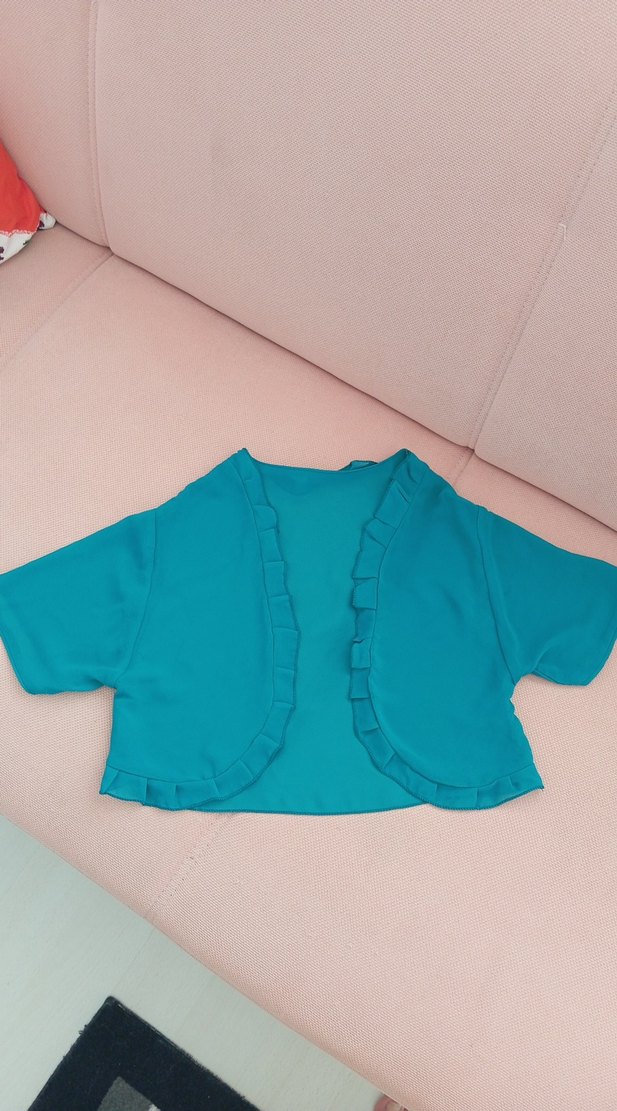 Kız çocuklar için turkuaz renkli, kısa kollu, yuvarlak yakalı, kenarları fırfırlı ve vücuda oturan bolero. Yumuşak ve sıcak dokuda, sokak stili için uygundur.