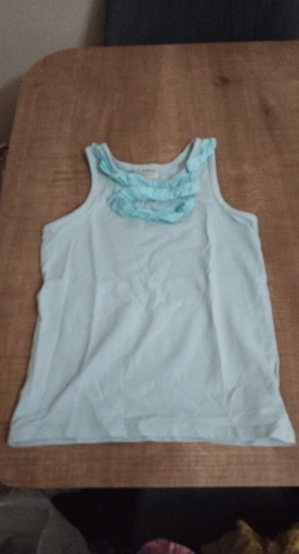 Kolsuz, turkuaz renkli kız çocuk atleti, yuvarlak yakada fırfır detayları ve vücuda oturan kesimiyle. Yumuşak keten kumaştan, sade ve basic tarzda, günlük kullanıma uygun.