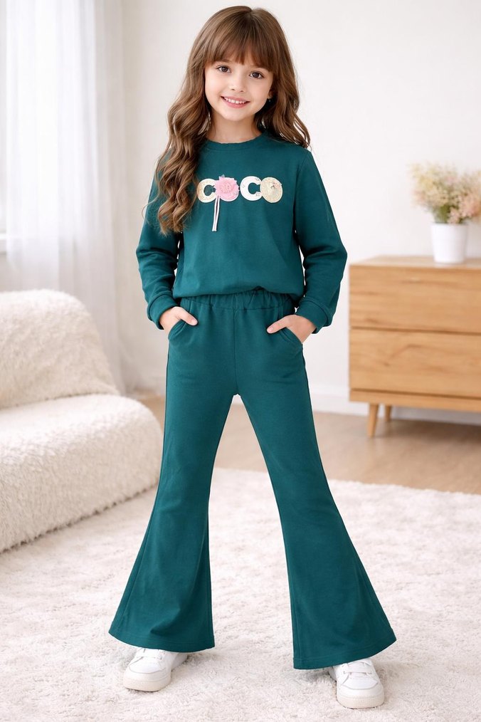 Kız çocuklar için turkuaz renkli, yumuşak ve kalın kumaştan, dantel detaylı ve pastel tonlarda batik desenli sweatshirt ve ispanyol paça eşofman takımı. Rahat ve şık.