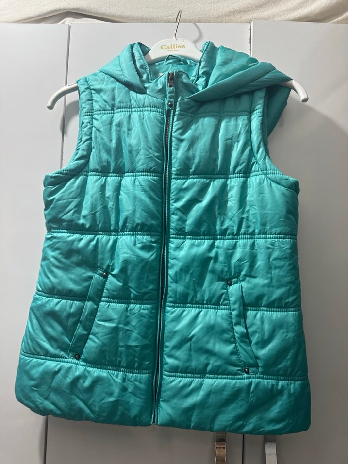 Turkuaz renkli, kapüşonlu ve fermuarlı, yumuşak ve sıcak kumaştan yapılmış kız çocuk yeleği. Cepleri ve vücuda oturan kesimi vardır. Boy 58 cm En 45 cm