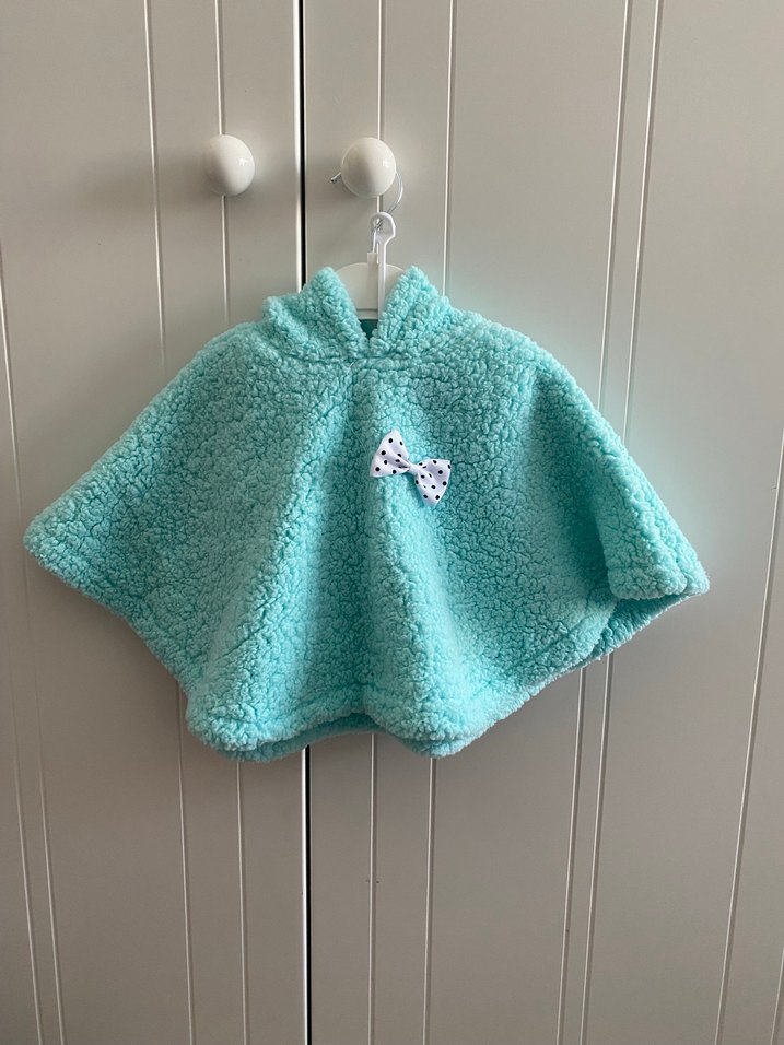 Kapüşonlu, uzun kollu, turkuaz renkli kız çocuk polar panço. Bol kesim ve küçük işlemeli fiyonk detayıyla rahat ve renkli.