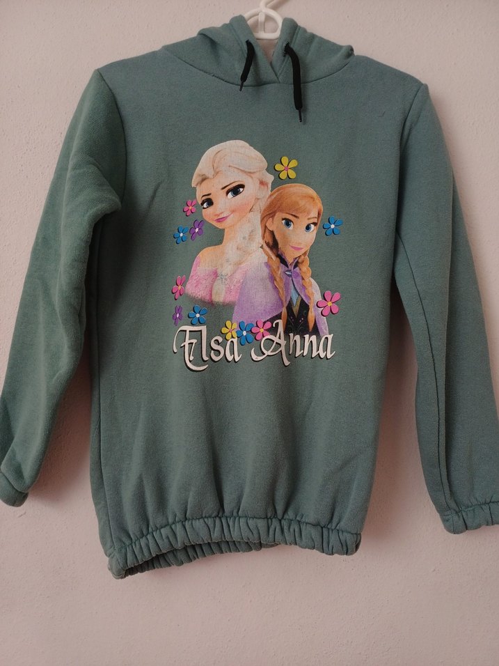 Turkuaz renkte, uzun kollu ve kapüşonlu kız çocuk sweatshirtü. Örgü dokusu ve yumuşak, sıcak kumaşıyla rahat bir kesime sahiptir, renkli baskı detaylıdır.