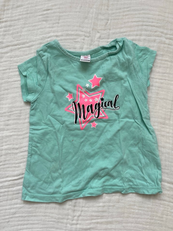 Kalıbı küçük. 0-3 aylık bebeğe giydirilir.Önünde küçük leke mevcut. Turkuaz renkli kız çocuk tişörtü, kısa kollu ve yuvarlak yakalıdır. Gevşek kesimi ve "Magical" yazılı pastel baskılı yıldız deseniyle öne çıkar.