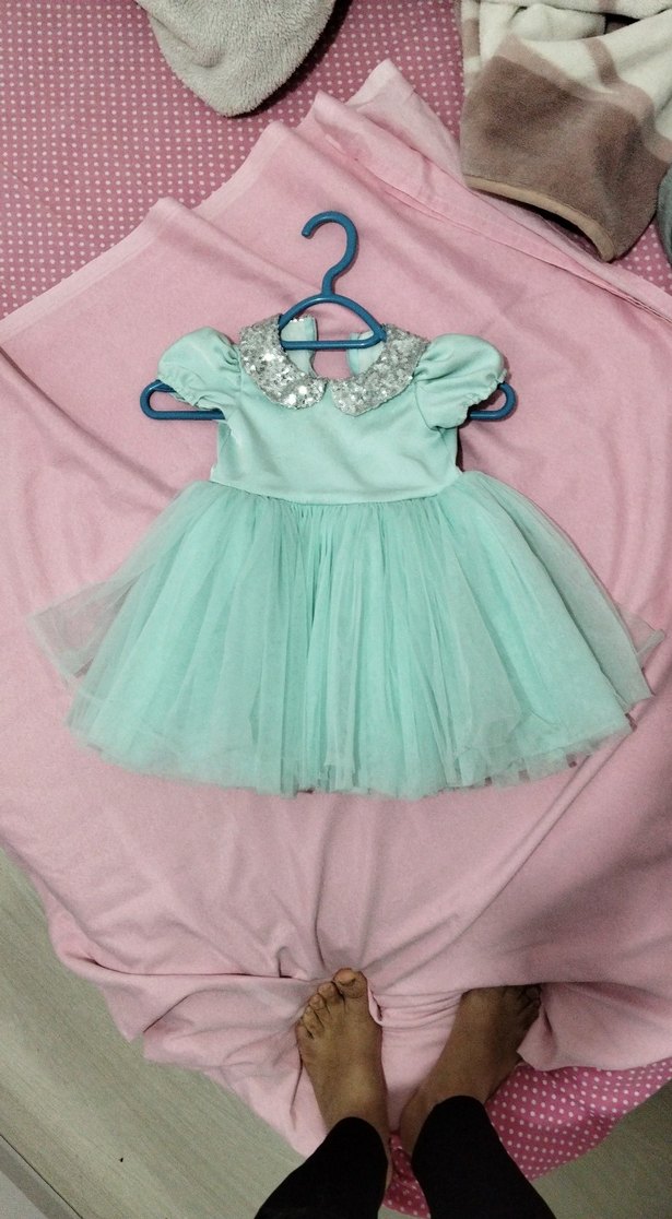 Kısa kollu, yakalı ve nakış detaylı turkuaz kız çocuk elbisesi, tül etek ve oturan kesimi ile modern klasik tarzı yansıtır. kabarık