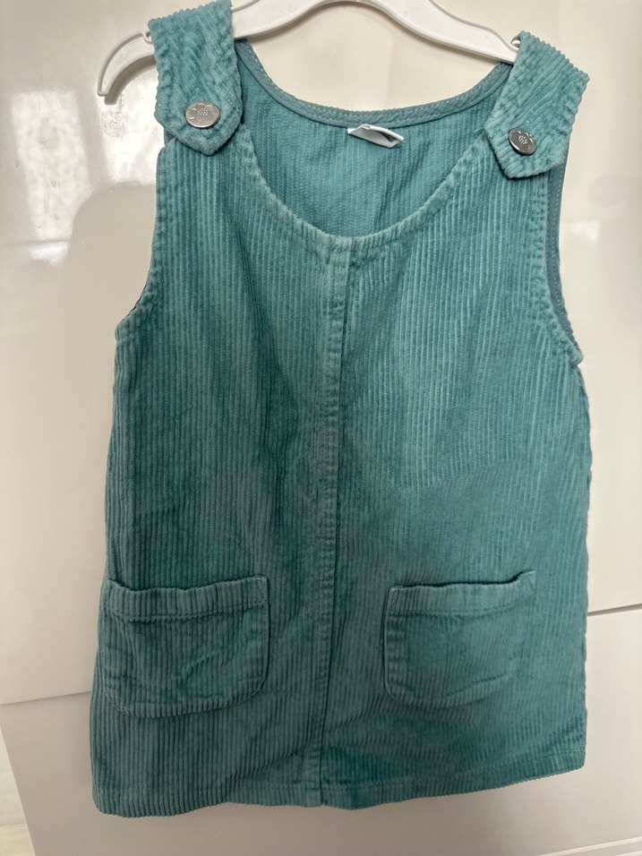 Yumuşak keten kumaştan, düğmeli askılı ve ön cepli, turkuaz renkli, bol kesim kız çocuk tulumu. Sokak stiline uygun.