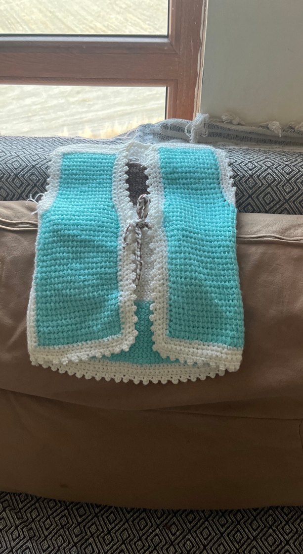 Tek renk turkuaz örgü kız çocuk yeleği, kolsuz ve dar kesimdir. Kayık yaka ve beyaz ince detaylarla sade bohem tarz sunar.