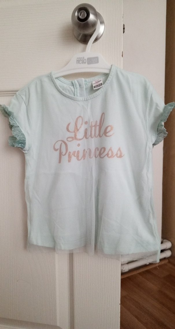 Kız çocuk turkuaz pamuk tişört, kısa kollu ve fırfırlı detaylara sahip. Salaş kesimi, yuvarlak yakası ve önünde "Little Princess" baskısı bulunur.