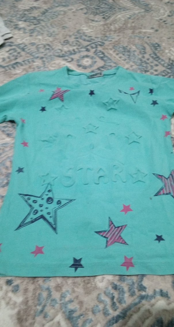 Turkuaz renkli, kısa kollu kız çocuk tişörtü. Parlak yıldız baskıları ve sim detayları ile rahat kesim, yuvarlak yaka modelidir.