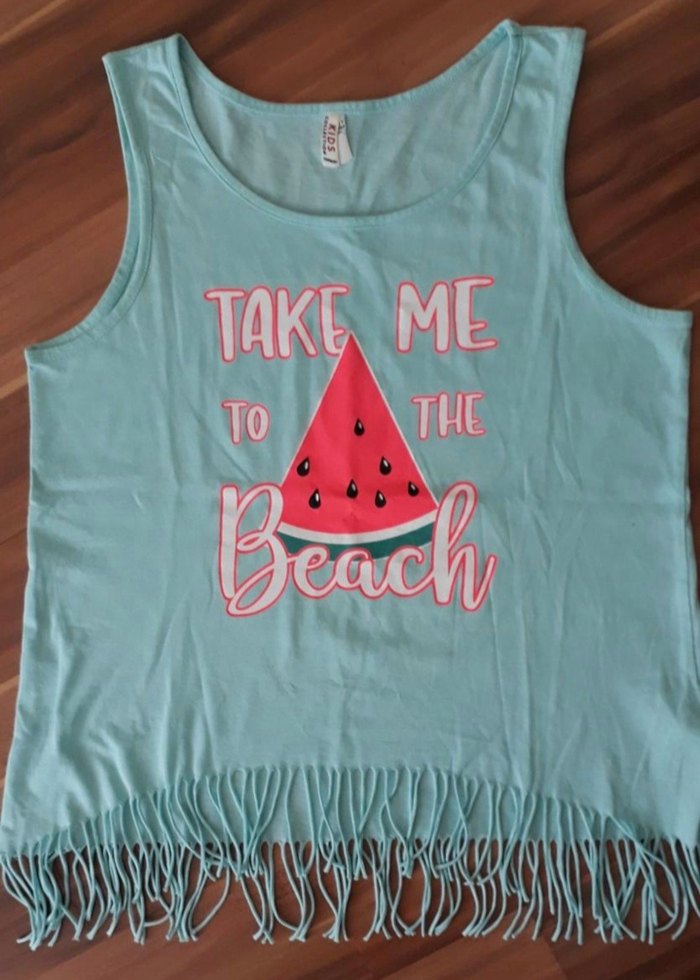Turkuaz renkli, kolsuz kız çocuk tişörtü, bol kesim, baskılı karpuz deseni ve etek kısmında püskül detaylı. Yuvarlak yaka ve bohem tarzda. kızıma geçen yıl almıştım bu yıl ufak geldi sıfır ayarındadır