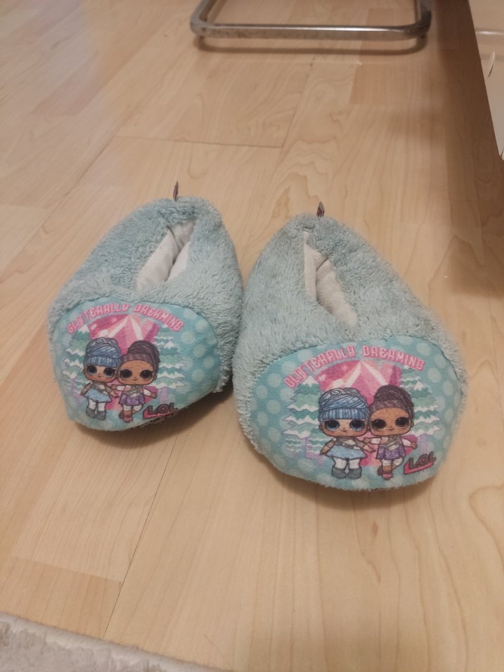 Turkuaz renkli, peluş ve örgü dokulu kız çocuk terlikleri; pop kültür baskılı, sıcak ve rahat bir stil sunar. 27-28 no