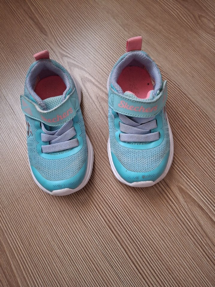 Turkuaz renkli, cırt cırtlı Skechers kız çocuk spor ayakkabısı. Kauçuk tabanlı, desen içermeyen, trendy sokak stili için uygun.