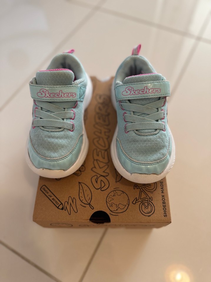 Turkuaz renkli Skechers kız çocuk spor ayakkabısı, cırt cırtlı bantlıdır. Kauçuk tabanlı, rahat ve dayanıklıdır.