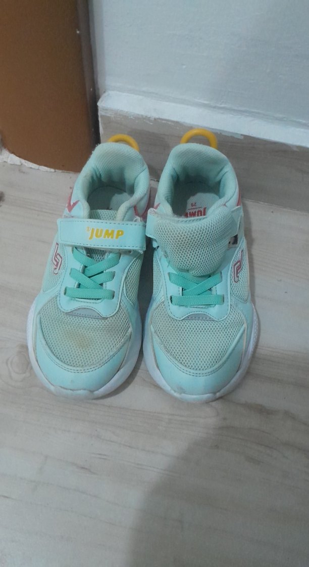 Turkuaz renkli, velcro bantlı kız çocuk spor ayakkabısı. Pastel tonlarda, kauçuk tabanlı ve 'JUMP' markalıdır.