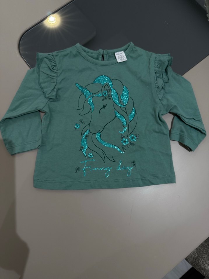 Turkuaz renkli kız çocuk uzun kollu tişört, rahat kesim ve fırfırlı kollara sahiptir. Yumuşak ve sıcak kumaştan, baskılı tek boynuzlu at figürlüdür.