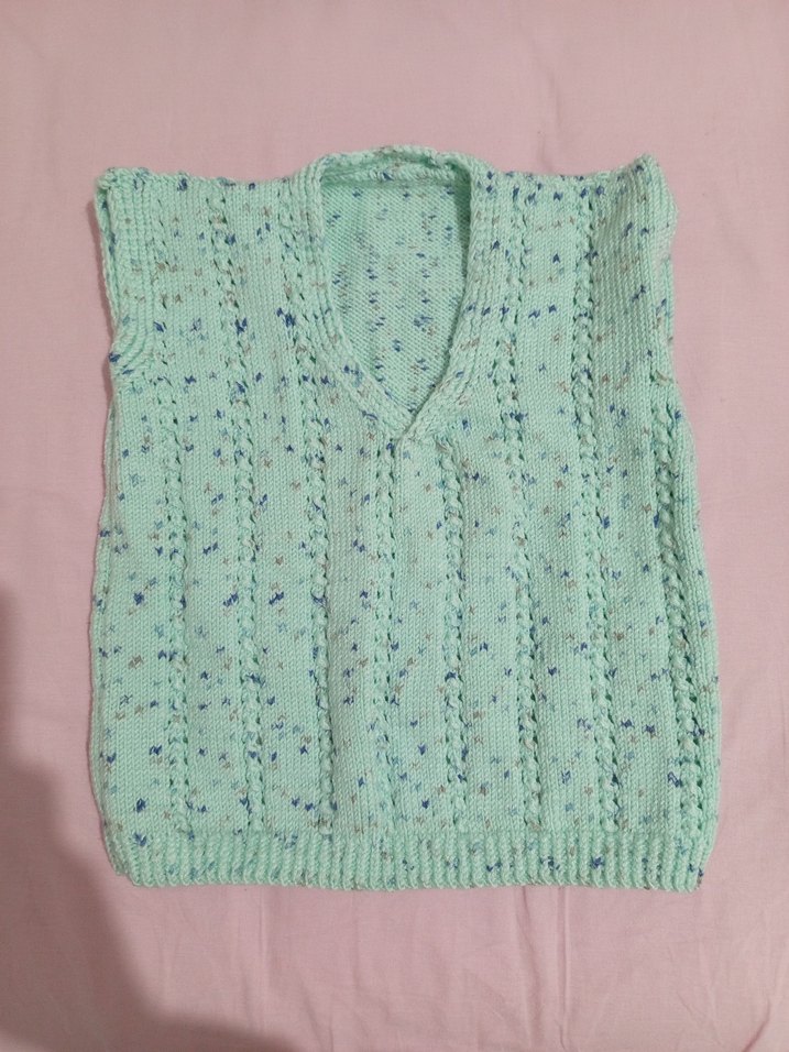 Kız çocukları için turkuaz renkte, V yaka, örme örgüden yapılmış, salaş kesim süveter. Bohem tarzını yansıtır.