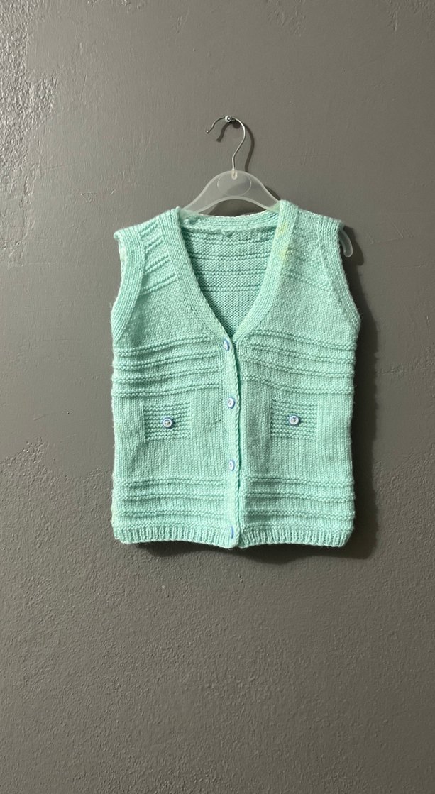 Turkuaz renkli, V yaka, kolsuz kız çocuk süveteri, yumuşak örgü kumaştan ve bol kesimdir. Ön kısmında iki küçük cepli ve düğmeli kapamalıdır. Sokak stili için uygun. El emeğidir sararmalar var ama yıkanınca geçer