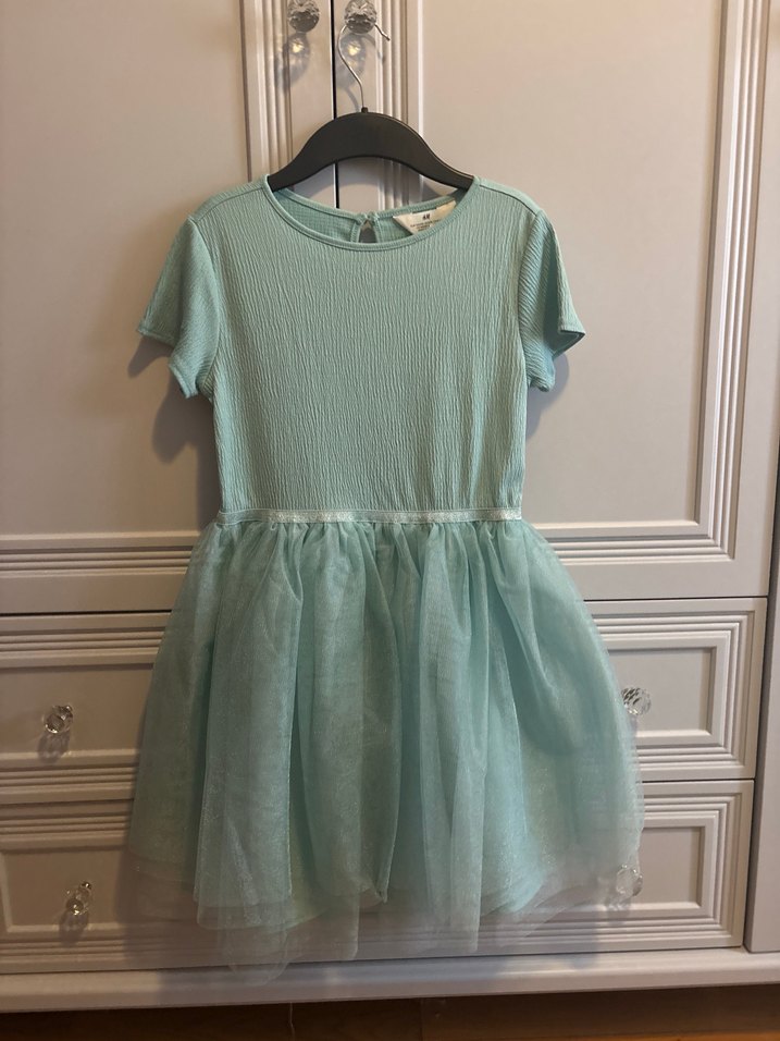 Kısa kollu, bisiklet yaka ve tütü etek detaylı turkuaz renk kız çocuk elbisesi. Rahat ve şık görünüm sağlar.