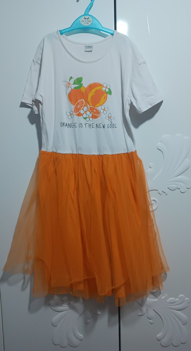 Kız çocuk elbisesi, kısa kollu ve yuvarlak yakalıdır. Üst kısmında "ORANGE IS THE NEW COOL" yazılı renkli baskı vardır. Pilili turuncu etek, canlı bir dokunuş sağlar.