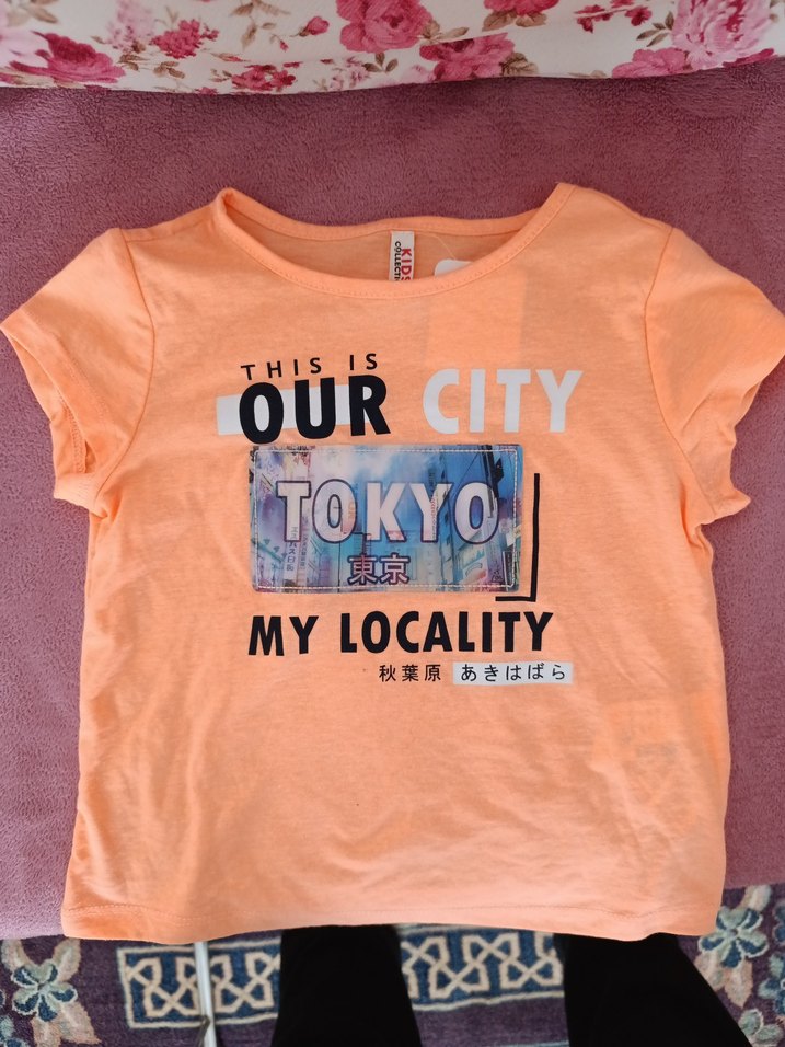 Turuncu renkli, kısa kollu, bol kesim kız çocuk tişörtü. Yuvarlak yakalı ve Tokyo şehir baskılıdır. Kız çocuk için kısa kollu t-shirt/body, 4-5 yaş bedeninde turuncu renkli ve baskılı üründür. Hiç kullanılmamış sıfır üründür ve etiketi üzerindedir.