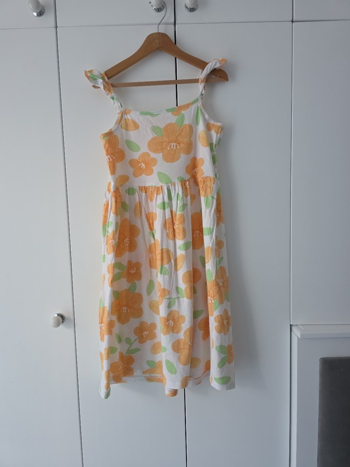 Kız çocukları için kolsuz, straplez ve fırfırlı detaylı bohem elbise. Yumuşak sentetik kumaştan, turuncu tonlarında pastel tie-dye çiçek desenli, bol kesim.