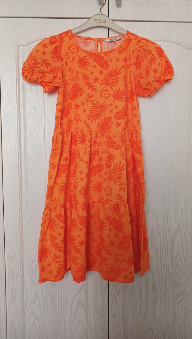 Kız çocuk turuncu renkli, kısa kollu, bisiklet yaka ve bol kesim elbise. Renkli tie-dye desenli, pilili ve bohem tarzda, yumuşak sentetik kumaştan yapılmıştır.