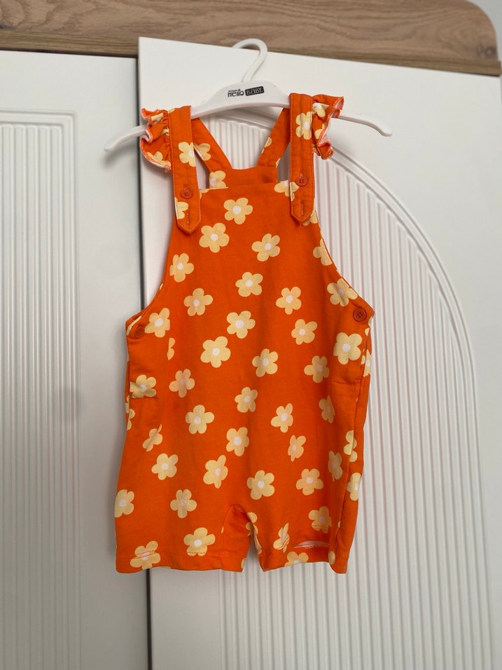 Turuncu renkli, çiçek desenli ve askılarında fırfır detayları bulunan, bol kesim kız çocuk tulumu.