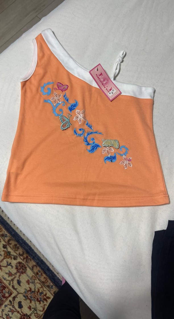 Kız çocukları için askısız, dantel detaylı ve çok renkli kelebek baskılı pastel turuncu bluz. Rahat ve bol kesim, günlük sokak stili için uygun.