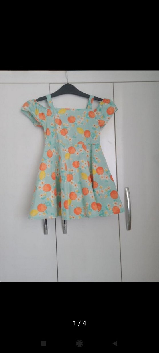 Kız çocuk elbisesi, kayık yaka, kısa kollu ve bol kesimdir. Yumuşak sentetik kumaştan yapılmış, pastel turuncu desenli ve pile detaylıdır.