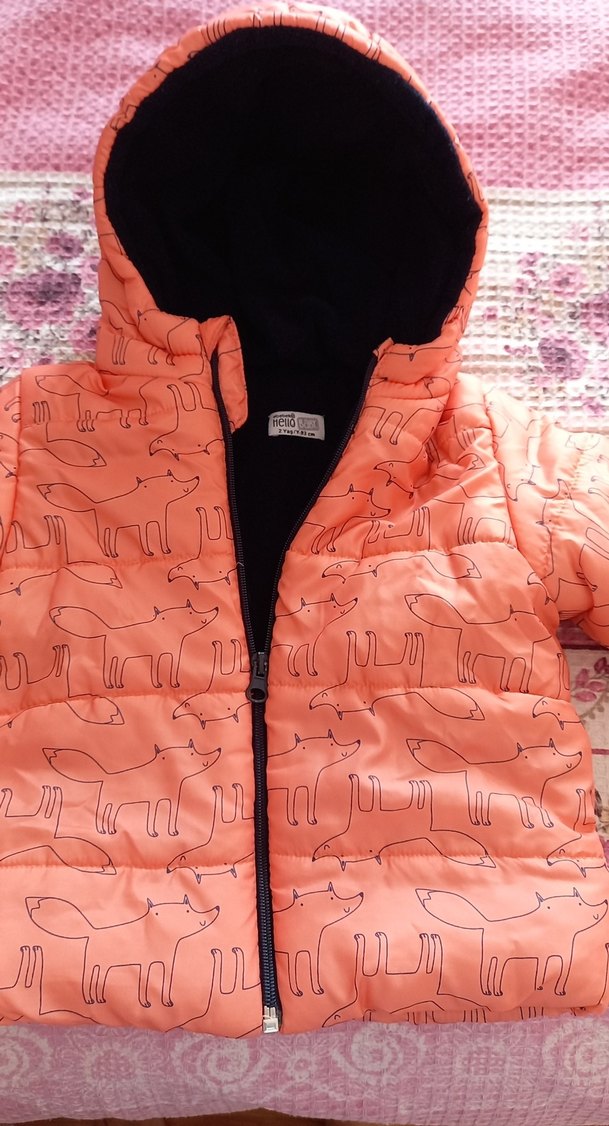 Kız çocukları için turuncu, fermuarlı, baskılı ve notched lapel yakalı dar kesim mont. Yumuşak ve sıcak iç yüzeye sahip, günlük sokak tarzı için uygun.