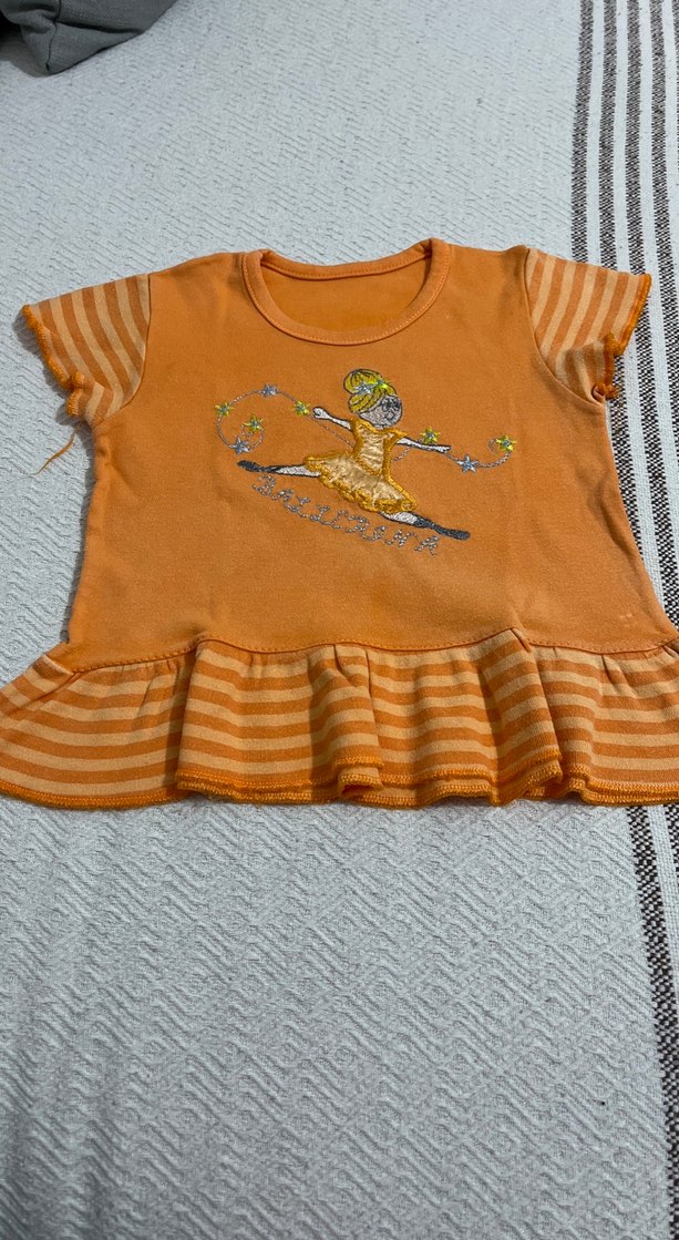 Kız çocuk tişörtü, kısa çizgili kollu ve fırfırlı etek ucu ile bol kesimdir. Parlak turuncu renkte, önünde baskılı desen bulunur. Yuvarlak yakalı, bohem tarzda bir üst.