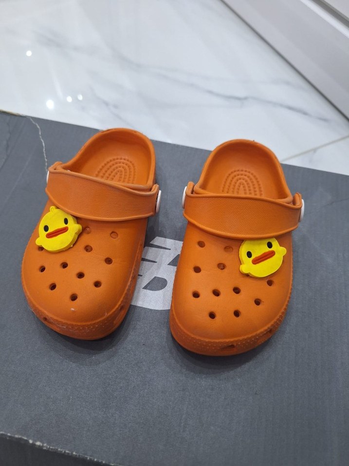 Kız çocukları için kauçuk malzemeden üretilmiş, tokalı bantlı, renkli baskılı ördek figürlü turuncu terlikler. Sokak stili ve sade, temel tasarım sunar. 24 numara