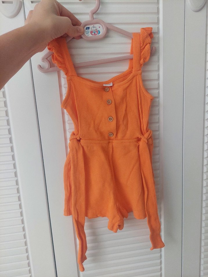 Turuncu keten kumaştan, düğmeli ve kolsuz, sokak tarzı kız çocuk tulumu. Hafif ve rahat, sıcak günler için ideal.