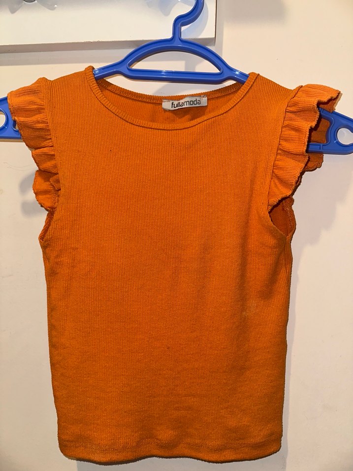 Bu kız çocuk tişörtü, keten kumaştan üretilmiş, parlak turuncu renkte, kolsuz ve fırfırlı detaylara sahip, dar kesim ve bisiklet yaka tasarıma sahiptir. S beden kadinlar için kız çocuklarıda uygun