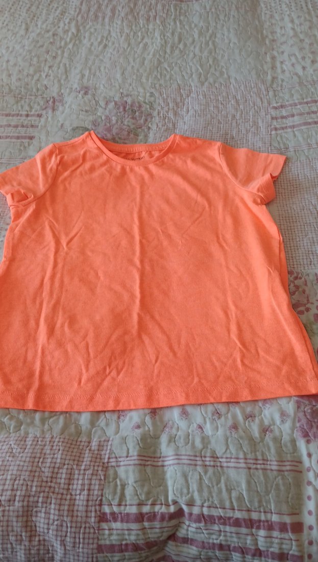 Kız çocuk için kısa kollu, yuvarlak yakalı ve bol kesim turuncu tişört. Yumuşak sentetik kumaştan, sade ve rahat bir tasarım sunar.