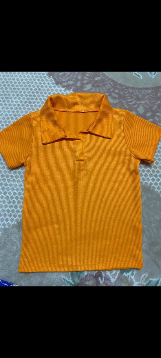 Kız çocuklar için fitted kesim turuncu polo yaka tişört. Düğmeli, kısa kollu ve renkli sentetik kumaştan üretilmiştir.
