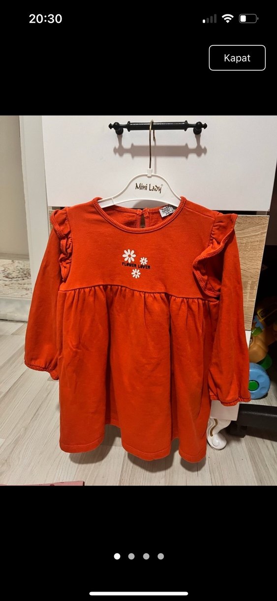 Kız çocuk elbise, uzun kollu ve bol kesimdir. Omuzlarda fırfır detayları ve işlemeli çiçek desenleri bulunur. Yumuşak ve sıcak kumaştan üretilmiştir.