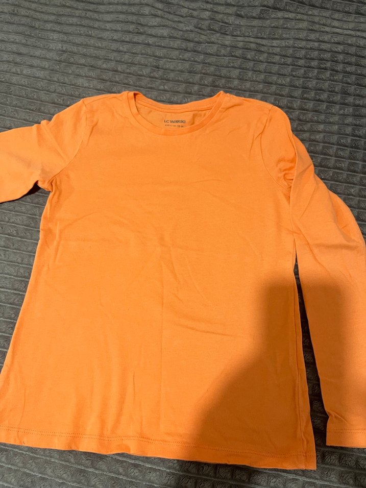 Kız çocukları için uzun kollu, bisiklet yaka, ince kesim tişört. Yumuşak penye kumaştan, pastel turuncu renkte sade tasarım. 9-10 yaş temizdir sorunsuz
