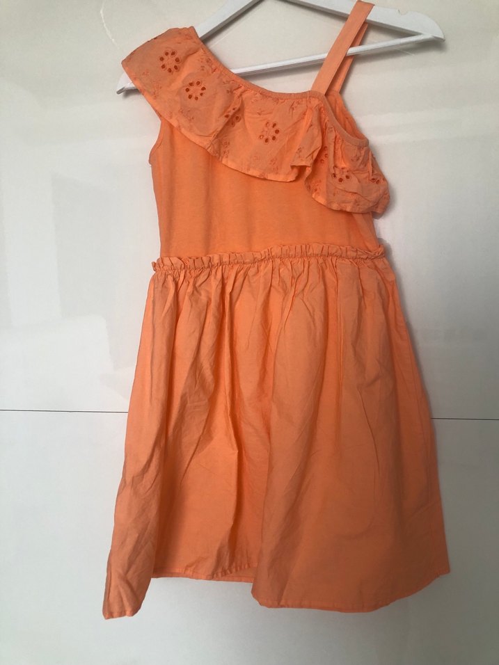 Keten kumaştan yapılmış, turuncu renkli, nakışlı volan detaylı, askılı ve bol kesim kız çocuk elbisesi.