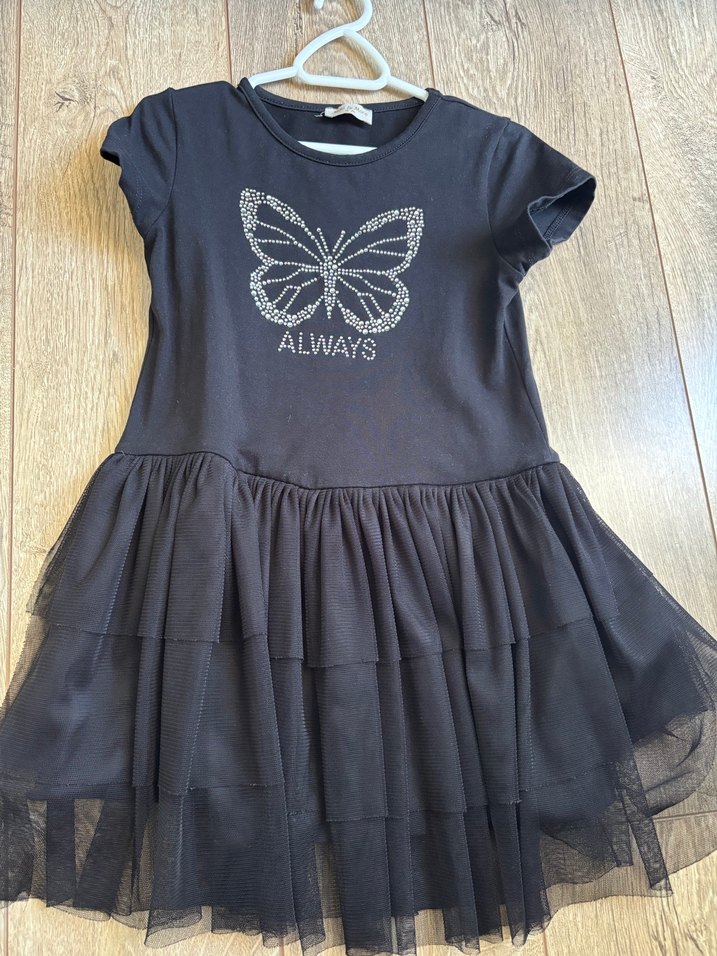 Kız çocuk kısa kollu, bol kesim ve fırfırlı etekli elbise. Önünde ALWAYS yazılı kelebek baskısı ve yuvarlak yaka bulunur. Yumuşak ve tok pamuk kumaştan, siyah renkte.