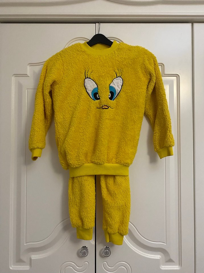 Sarı renkli, nakışlı kız çocuk ikili takımı, uzun kollu ve bisiklet yaka, rahat ve bol kesimdir. Street wear tarzında kullanıma uygundur.