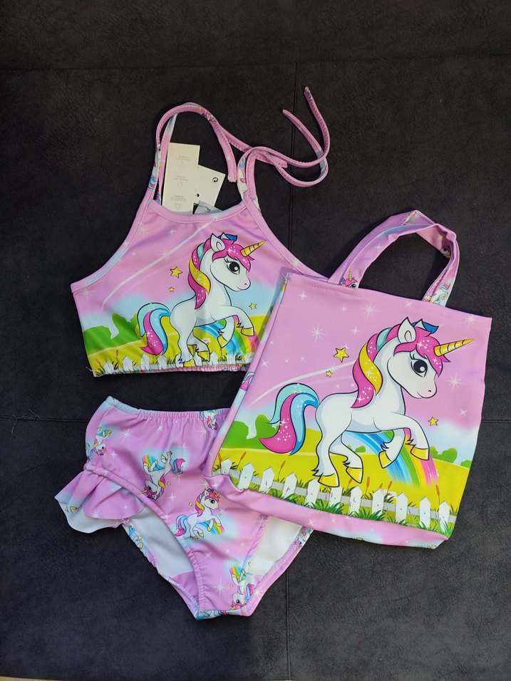 Pastel pembe renkli, unicorn baskılı kız çocuk bikini seti ve uyumlu çanta. Askılı tasarımıyla havuz- plaj kullanımı için uygun. Çabuk kuruyan mayo kumaşından üretilmiştir. etiketi üzerinde