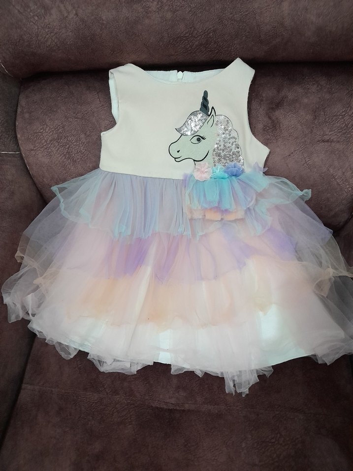Kız çocuklar için unicorn baskılı, fırfırlı katmanlı, pastel renklerde tütülü elbise, doğum günü elbisesi düğün elbisesi her yerde kullanılabilir, içi hem saten hem keten iki kat astarlıdır 1 kere giyildi, yepyeni. tüllü elbise. Unıcorn konsept elbise