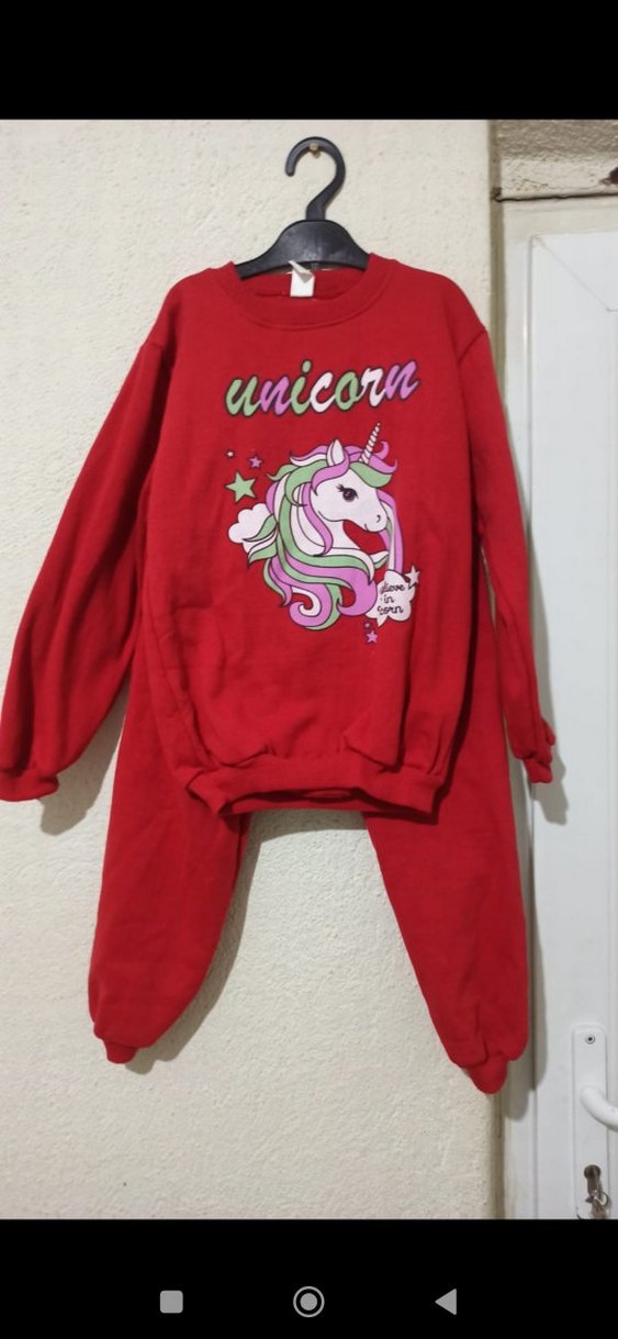 Kız çocukları için kırmızı, bol kesim, yumuşak ve sıcak kumaştan eşofman takımı. Uzun kollu, bisiklet yaka, önünde renkli unicorn baskısı bulunur.