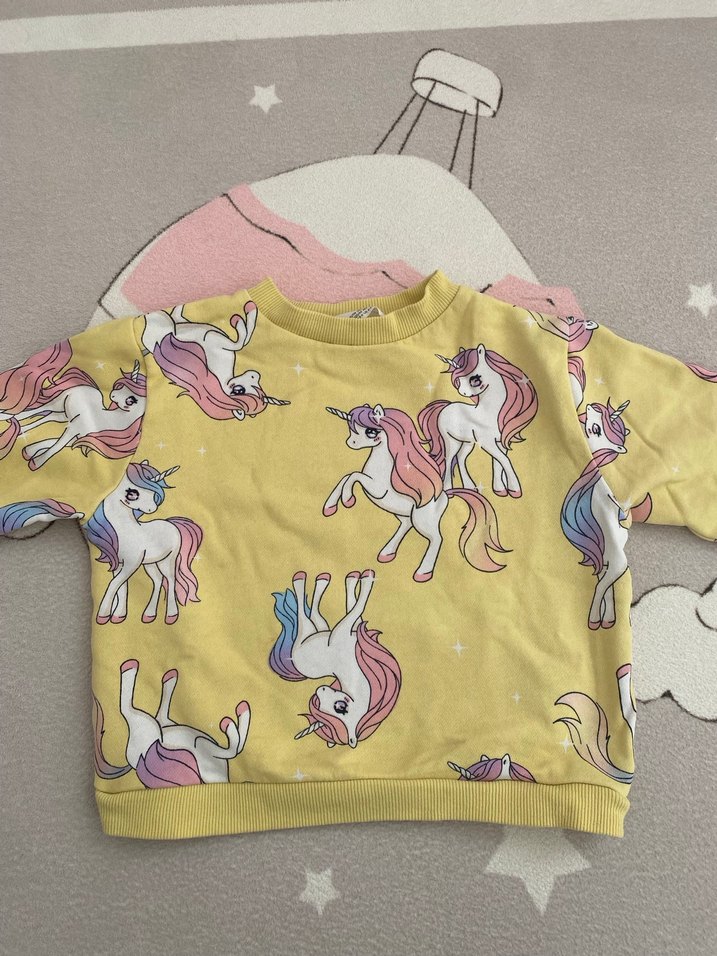 Uzun kollu, bisiklet yaka,sarı sweatshirt, unicorn baskılı. Etiket bedeni4-6 yaş ama 4-5 yaş arası kullanabildik sonrasında küçük geldi.kalıp küçük