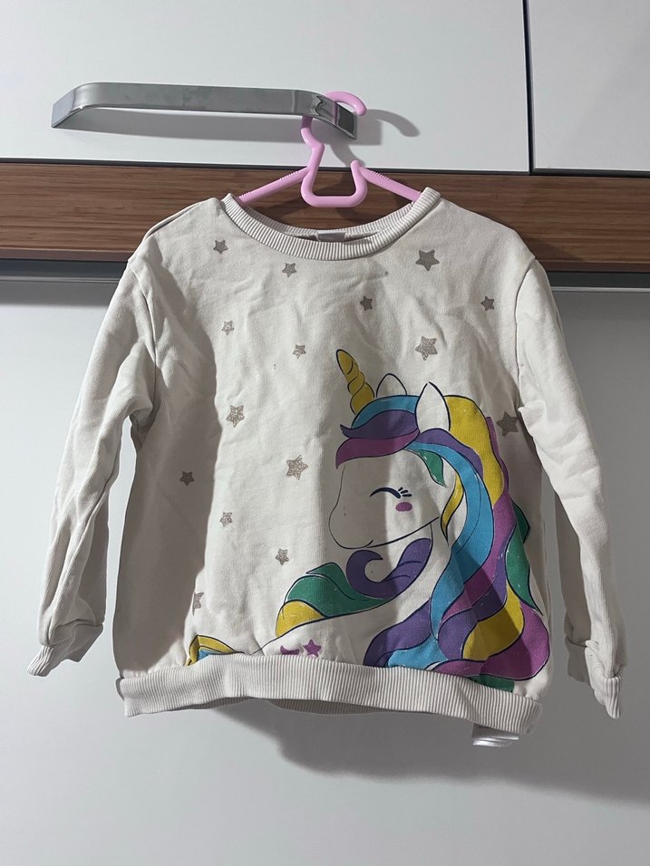 Kız çocukları için uzun kollu, yuvarlak yakalı ve bol kesim sweatshirt. Beyaz renkte, renkli unicorn baskısı ve yıldız detaylarıyla yumuşak örme kumaştan üretilmiştir.